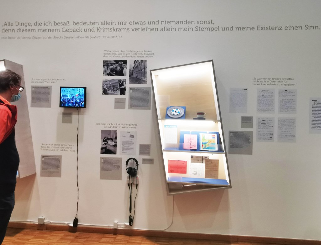 Die Ausstellung wird zusätzlich von einem Medienspiegel, mit der Überschrift „Ein Emigrant sein heißt, […] nicht von Null anzufangen, sondern von Minus“ begleitet. Diese Aussage stammt von einem Geflüchteten aus Sarajevo.[3] Die Zeitungsberichte, welche in den Jahren 1991 bis 1999 in verschiedenen österreichischen Zeitungen und Zeitschriften zur Situation von Flüchtlingen aus den Kriegsgebieten des ehemaligen Jugoslawiens in Österreich. Die darin behandelten Themen reichen vom Alltag Geflüchteter in der neuen Umgebung, sprich Wien, von den bürokratischen Hürden, welche ihre persönliche und rechtliche Integration deutlich erschwerten, über zivilgesellschaftliche Hilfsinitiativen, bis hin zu staatlicher Rückkehrpolitik. Diese Artikel geben einen Einblick in zeitgenössische politische und mediale Diskurse, sowie in vorherrschende gesellschaftliche Stimmungsbilder. Schaustücke, Wandaufschriften, persönliche Gegenstände, wie eine Briefschachten, Schmuck und Brieftasche die man bei der Flucht bei sich hatte, Dokumente und Fotos bilden neben an die Wand geschriebenen Aussagen der Geflüchteten den Rahmen der Ausstellung und folgen somit einer bewusst gewählten Storyline um „Räume der Erinnerung […]“ zu schaffen.[4]