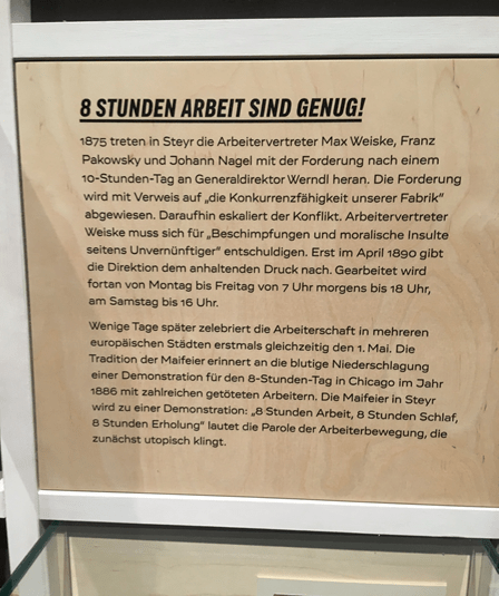 Da ich ja in der Gruppe zum Thema „Zeitregime“ am Brunnenmarkt recherchiere und forsche, fand ich persönlich jene Stationen am spannendsten, die sich mit dem Zeitregime befassen. Die Einführung des 8-Stunden Tages oder die 5-Tage Woche als Paradigmenwechsel im wöchentlichen Alltag der arbeitenden Menschen sind zwei Beispiele dafür. Das folgende Foto einer Museumstafel, welches ich vor Ort aufgenommen habe, behandelt den Prozess dieser revolutionären Errungenschaft der Arbeitsbewegung: