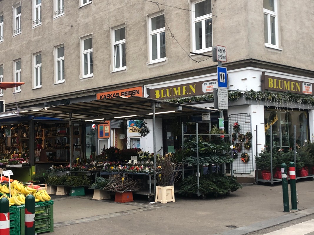 An einer der vielen Ecken des Brunnenmarkts steht der Blumenladen. Ein Blick in die Auslage zeigt eine bunte Vielfalt an Knospen, Blüten und Pflanzen.