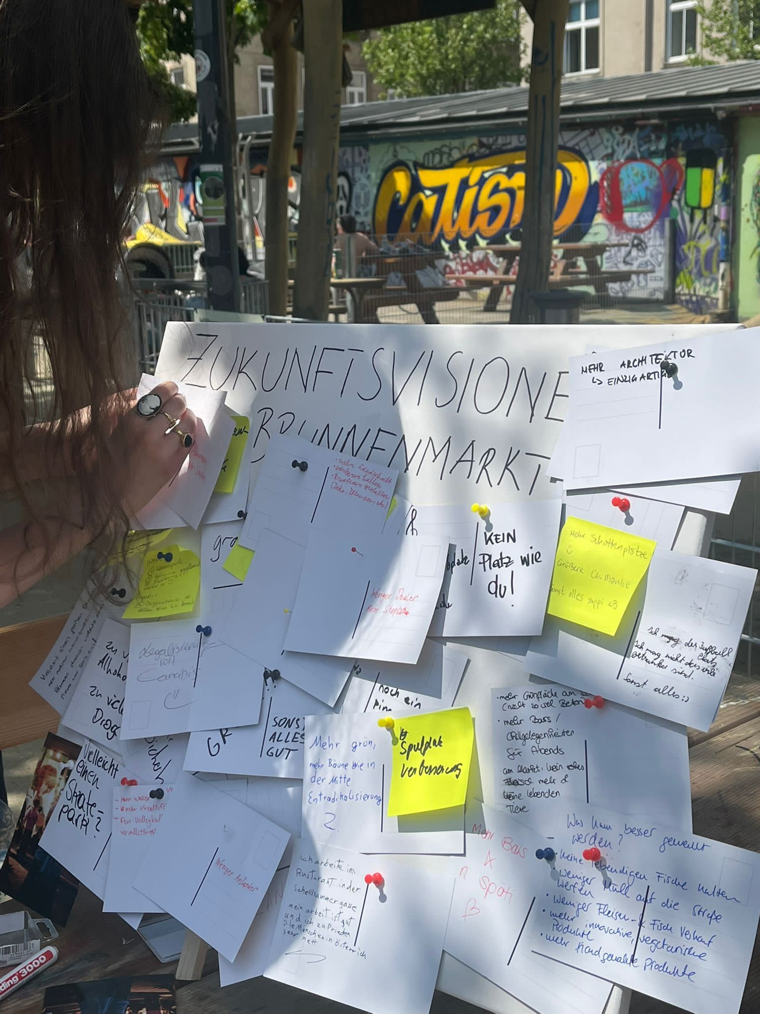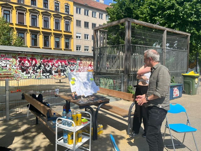 Die Sonne wärmte unsere Köpfe als wir an einem heißen Mittwochnachmittag im Brunnenviertel ankamen und alle nötigen Vorbereitungen trafen. Mit vorsichtigem Optimismus und allerlei Getränken ausgerüstet, machten wir uns auf die Suche nach Menschen, die bereit wären mit uns über den Yppenplatz zu sprechen. Wir hatten zudem einen kleinen Stand nahe dem Spielplatz im Yppenpark aufgestellt, worauf eine Staffelei mit der Überschrift: „Zukunftsvisionen Brunnenmarkt“ thronte.