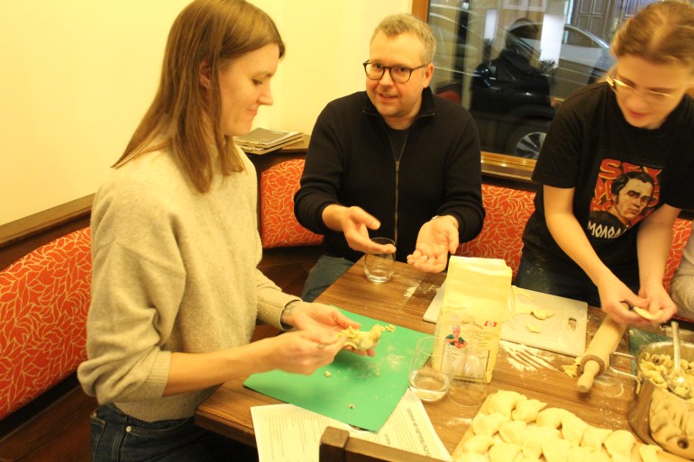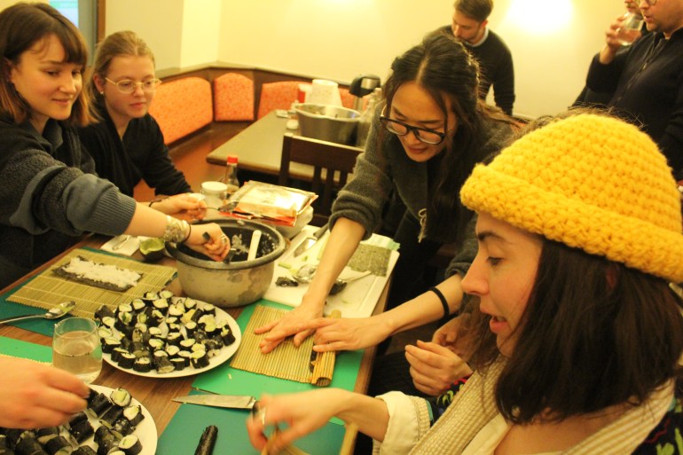 Nach einer kurzen Einführung durch Speisen ohne Grenzen, die Grätzlerei und das Caring Community Collective ging es direkt ans Kochen. Die Teilnehmer*innen konnten zwischen verschiedenen Stationen wechseln und Gerichte aus aller Welt zubereiten: von ukrainischen Varenyky über japanische Makis, steirische Kürbiscremesuppe und Berliner Buletten bis hin zu türkischem Ayran.